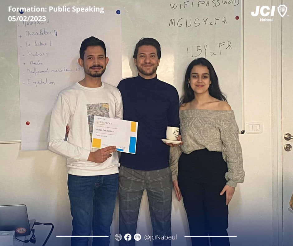 Nous tenons à remercier chaleureusement notre formateur, Sultan Chemingui, pour son engagement et son expertise. En tant que coach en développement personnel, Sultan a guidé nos participants à travers les principes fondamentaux de la prise de parole en public, de la gestion du trac, et de la création d’un impact durable.